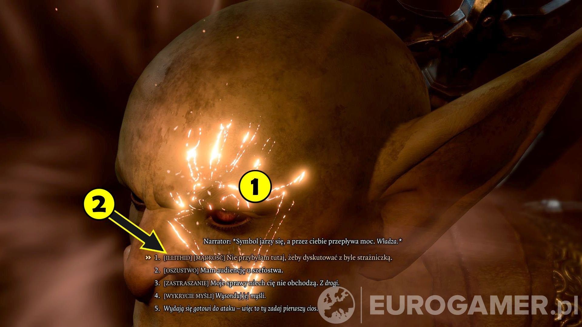 W dialogach z pomocą pasożyta możesz zmusić do posłuszeństwa pomniejsze istoty wyznające wiarę w Absolut. Posiadają one piętno (1), a w dialogach ujrzysz oznaczoną opcję Illithid (2), która (niemal) zawsze prowadzi do rozwoju sytuacji po twojej myśli.