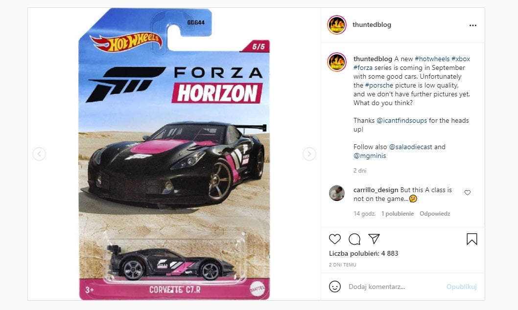 Profil T-Hunted Blog na Instagramie - zajmujący się przedstawianiem nowości w ofertach firm produkujących miniaturowe modele aut - opublikował zdjęcia kilku nowych propozycji od firmy Hot Wheels. Modele z Forzy Horizon zadebiutują we wrześniu.