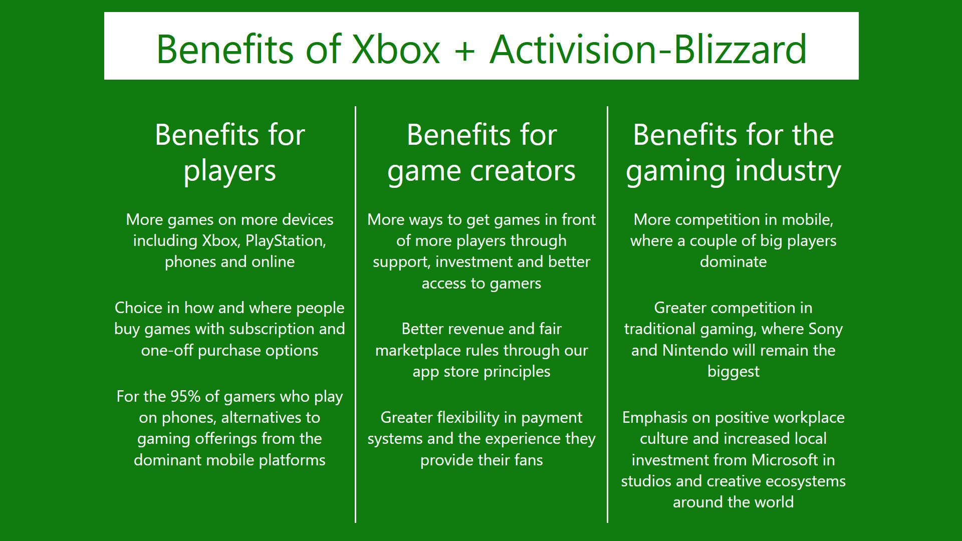 Według Microsoftu, przejęcie Activison-Blizzard będzie oznaczało dla graczy więcej gier na większej liczbie urządzeń, w tym na PlayStation, w chmurze oraz na urządzeniach mobilnych. Umożliwi wybór między kupowaniem gier za pełną cenę, a graniem w ramach usługi Game Pass oraz stworzy alternatywę dla App Store i Google Play na telefonach i tabletach.