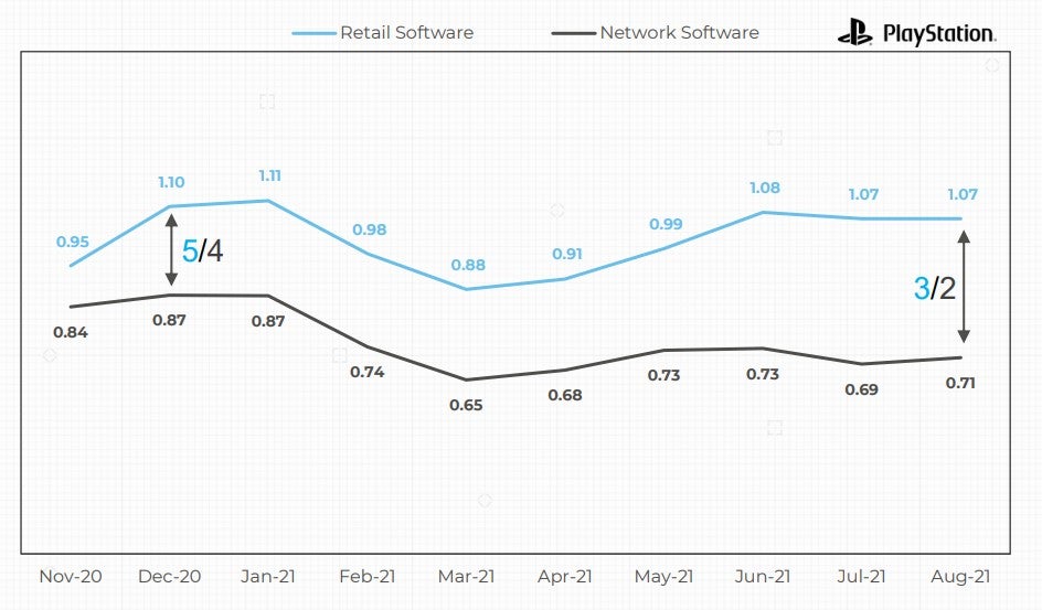 Według GSD, do końca sierpnia bieżącego roku sprzedano 10,14 milionów pudełkowych wersji gier na PS5 oraz 7,51 milionów edycji cyfrowych. To oznacza, że fizyczne tytuły wyprzedzają elektroniczne w stosunku 3 do 2.